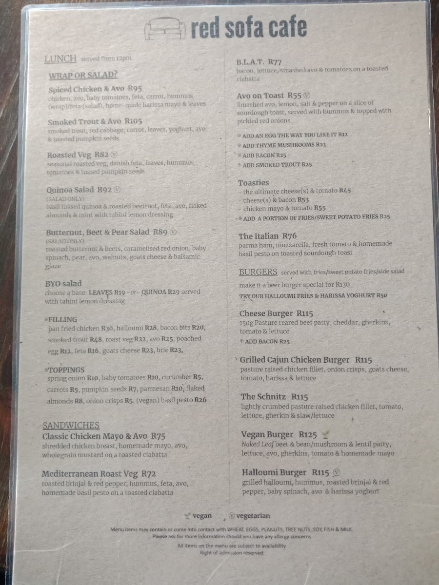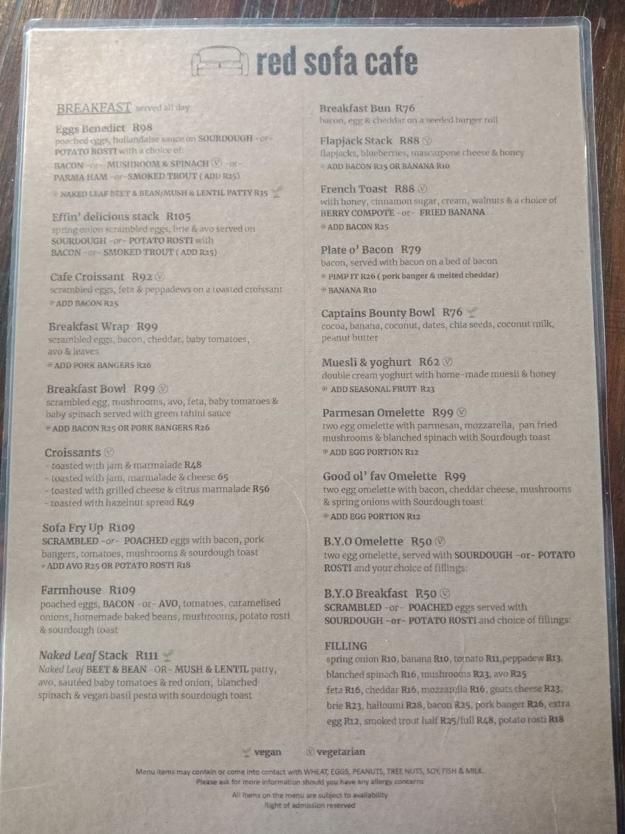 Welcome to Red Sofa Cafe & Deli, a charming retreat nestled in Vredehoek, Cape Town. Here, delicious comfort food meets a cozy atmosphere, making it the ideal location for a leisurely meal any time of day. Breakfast is served all day, offering delights such as the heavenly Egg Benedict with bacon or a savory omelette packed with parmesan and fresh spinach mushrooms.